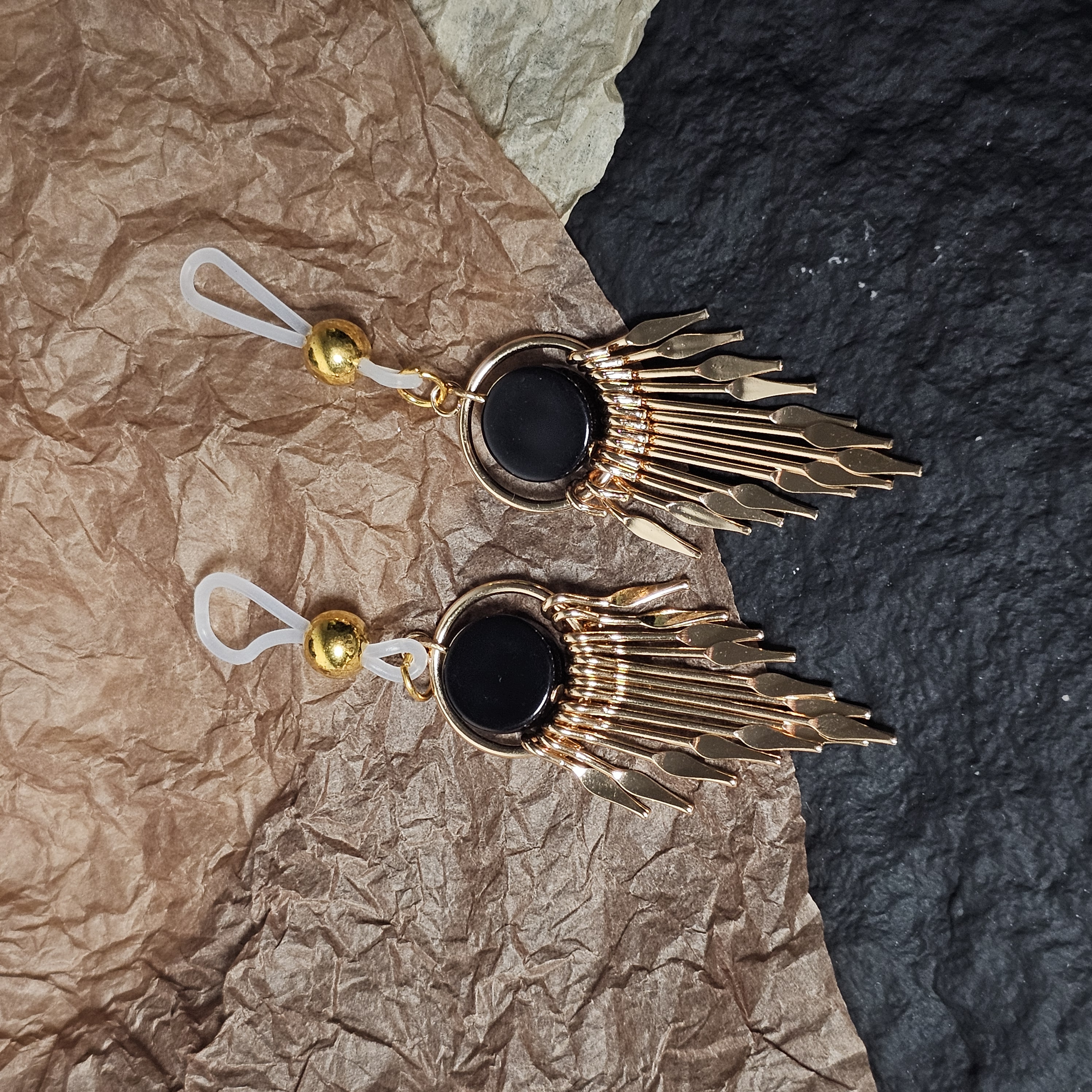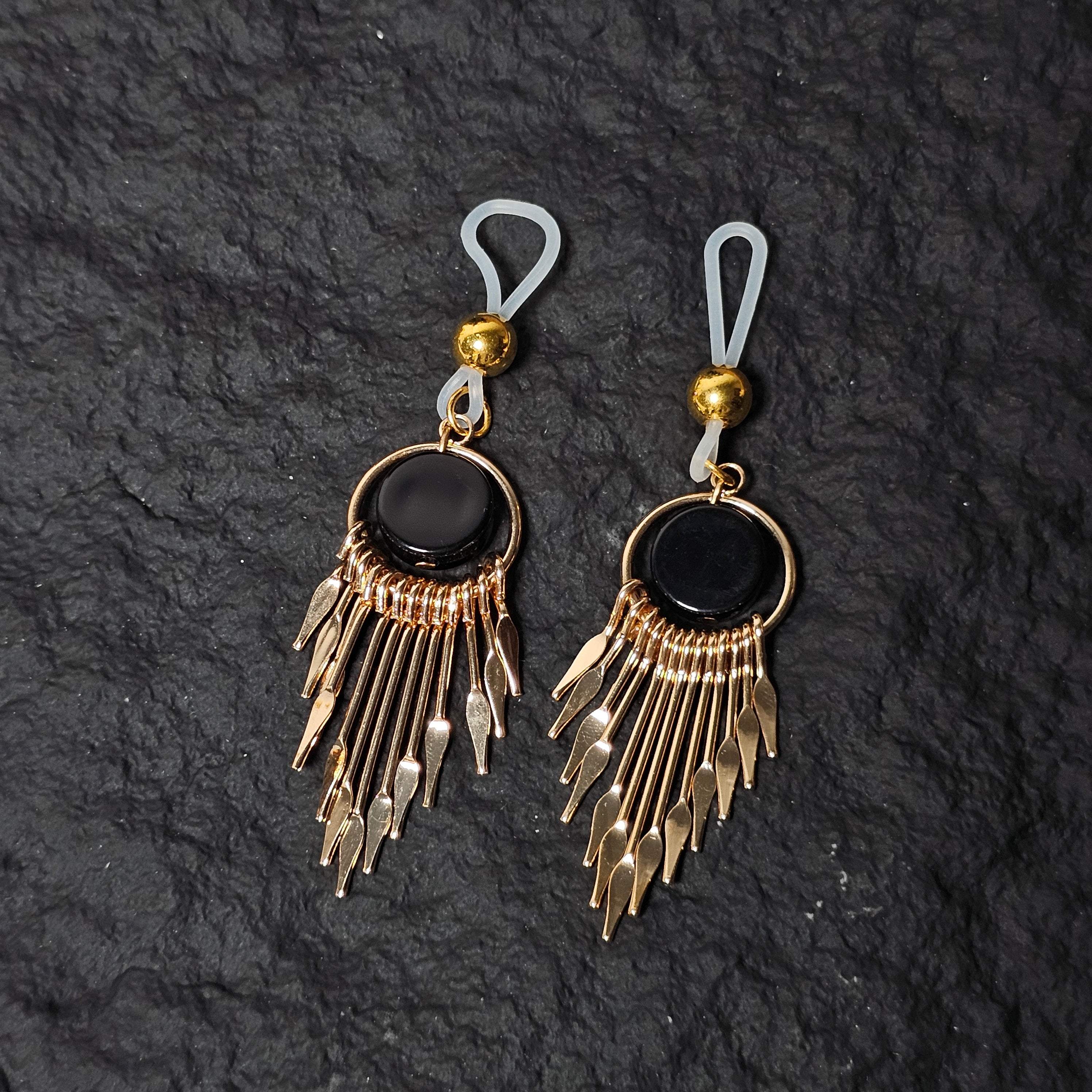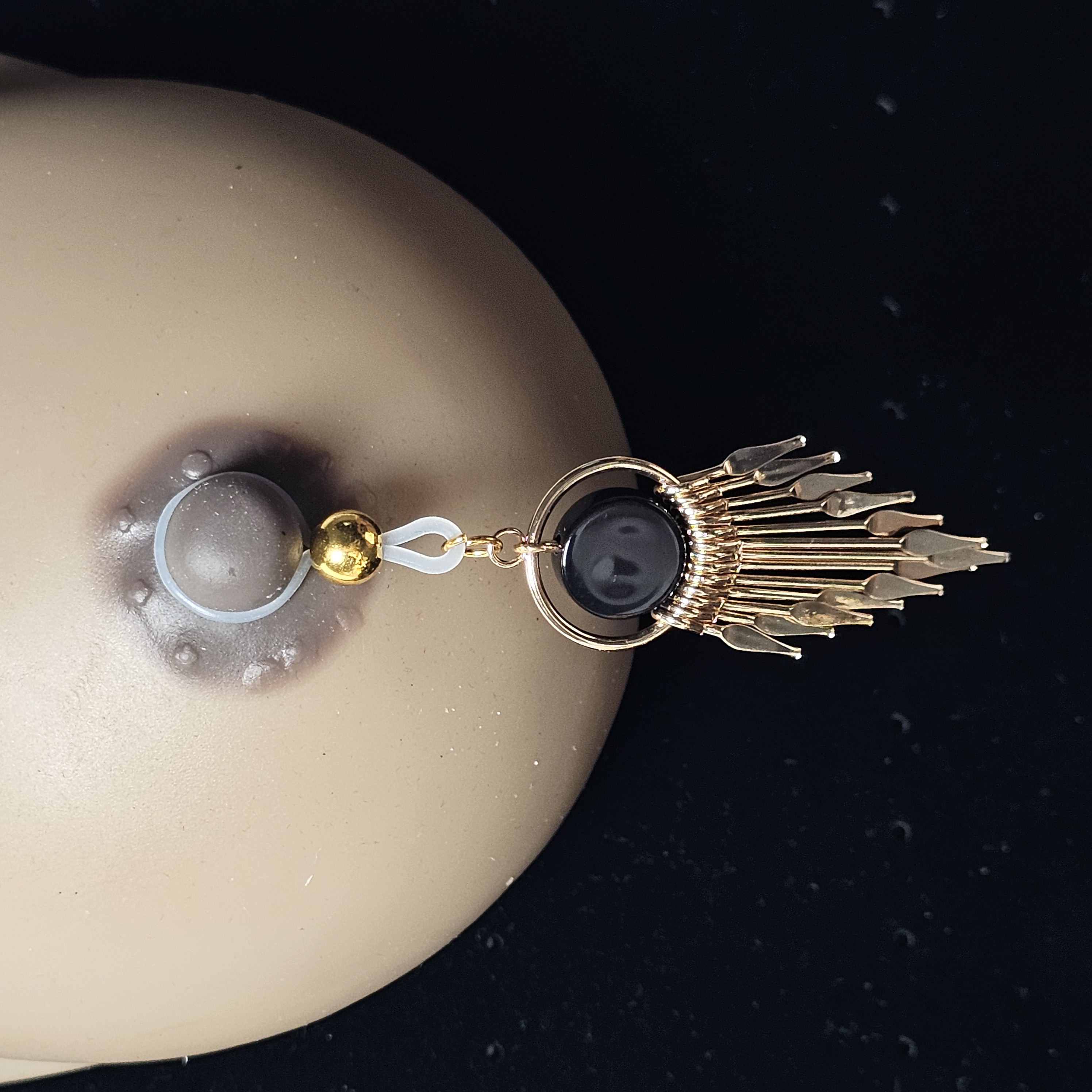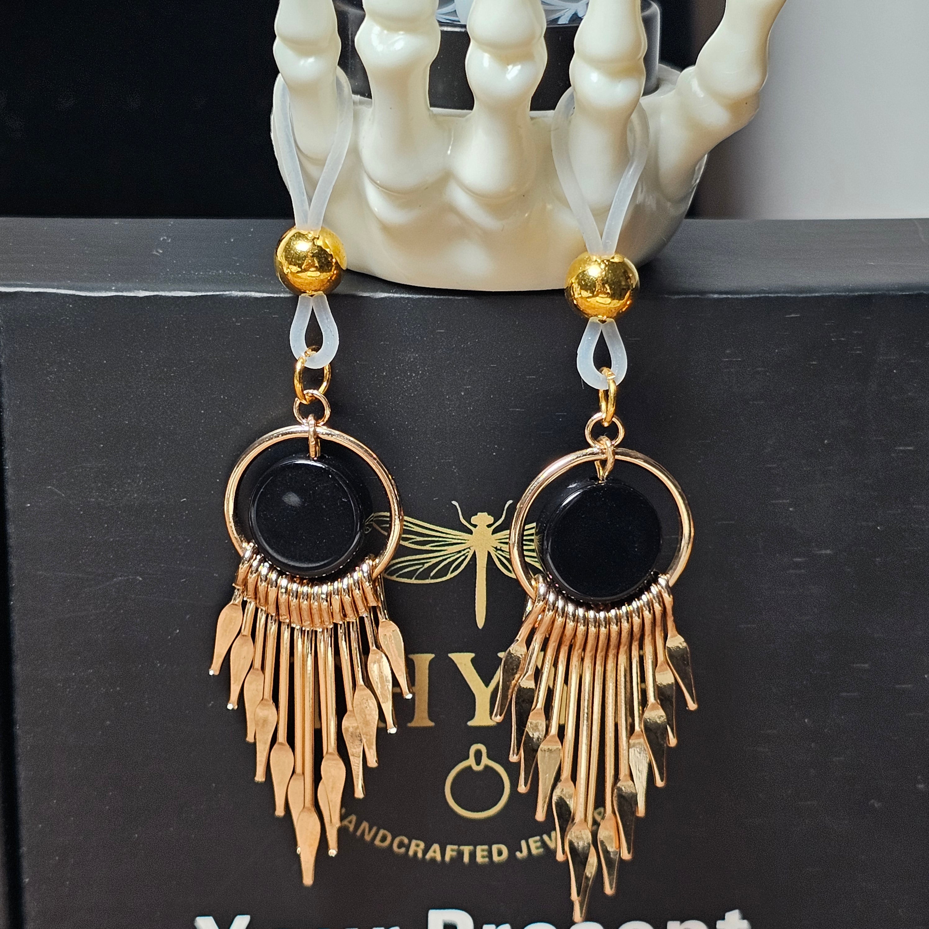 This nipple clamp is designed for those who seek a unique and stylish look. The pendant is crafted from exquisite black and gold, creating a unique black and gold combination that exudes captivating elegance. The tassel design creates a dynamic aesthetic, gently swaying with every movement, adding a touch of femininity and sensuality.