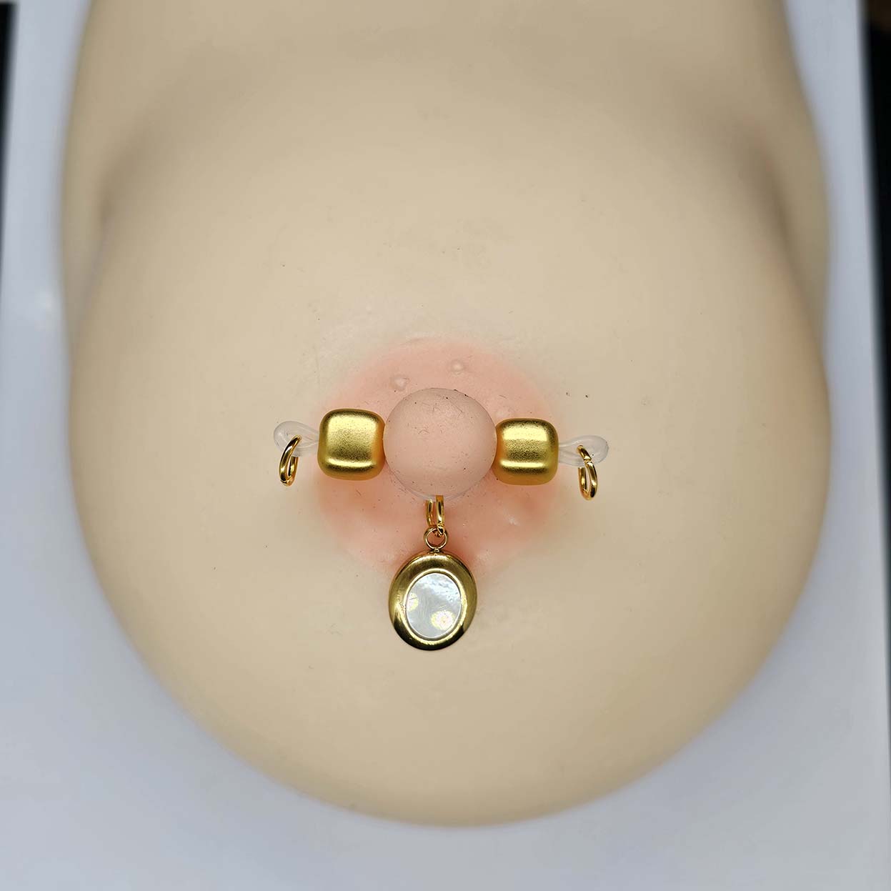 Sleek square gold beads pair seamlessly with an oval pendant set with a lustrous white pearl, creating a look that is both elegant and contemporary. The barbell-style adjustable nipple clips exude quiet sophistication, blending minimalism with sensual charm. The warm gold tone contrasts beautifully with the soft pearl sheen, making it a timeless piece that feels luxurious yet modern. Ideal for those who appreciate subtle glamour and refined design.