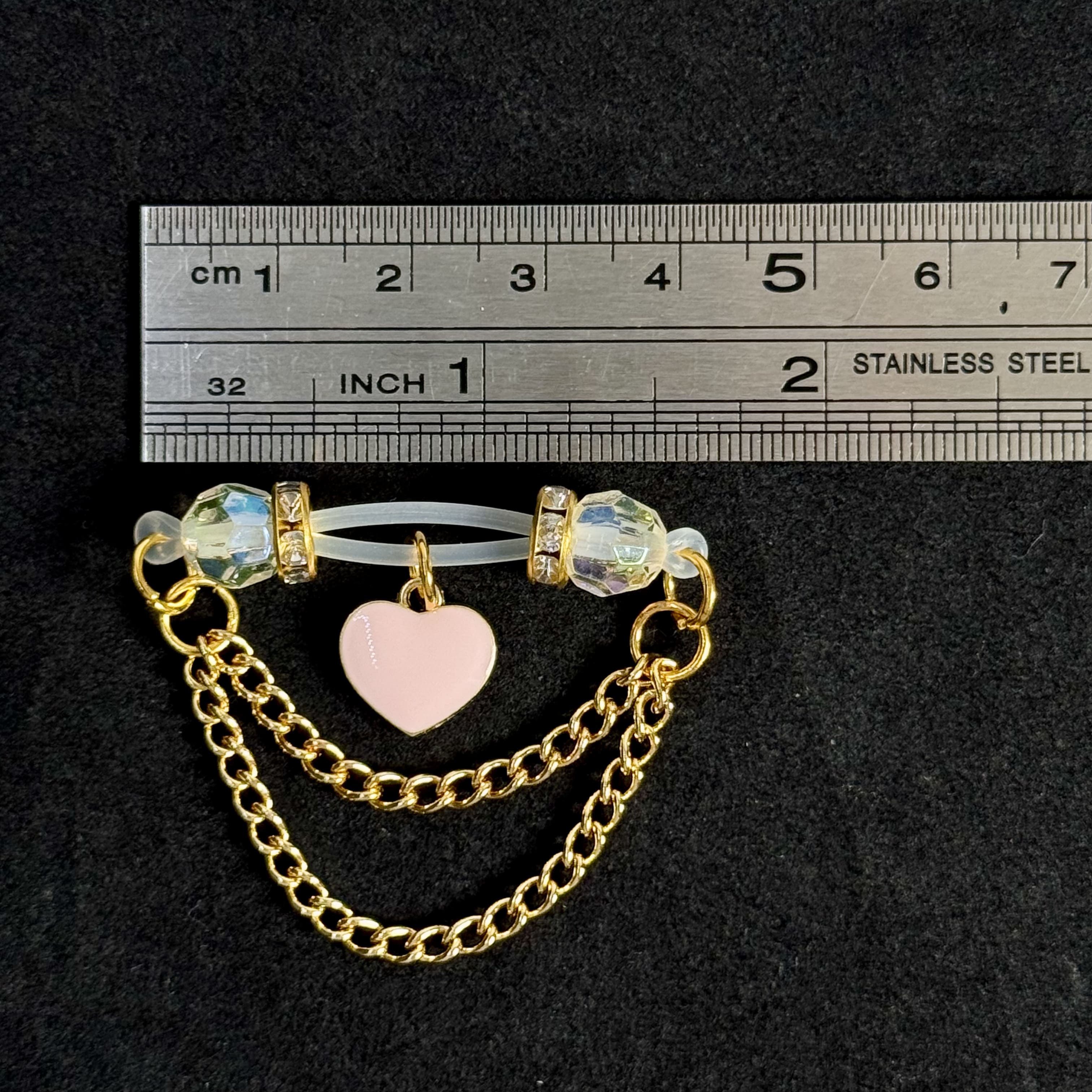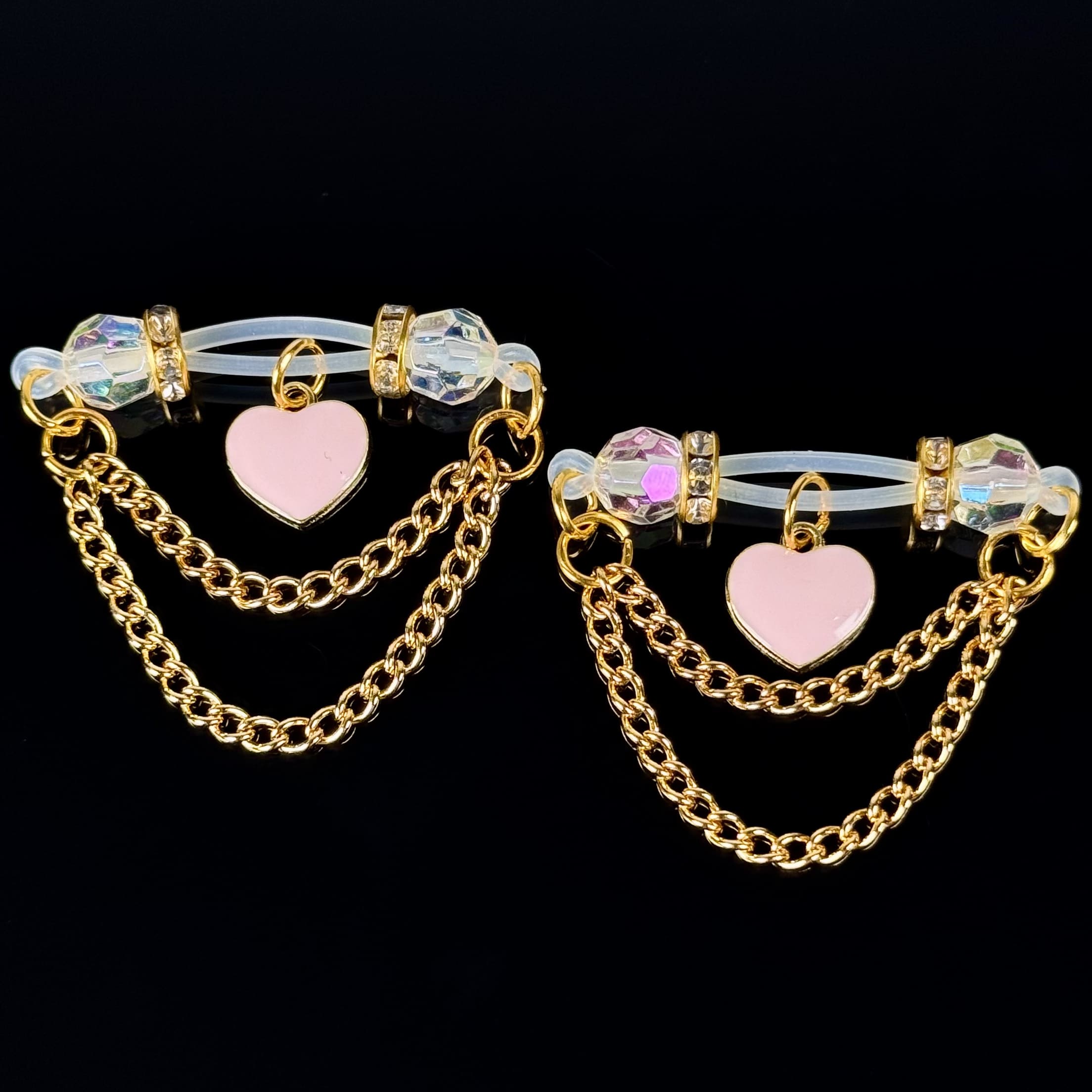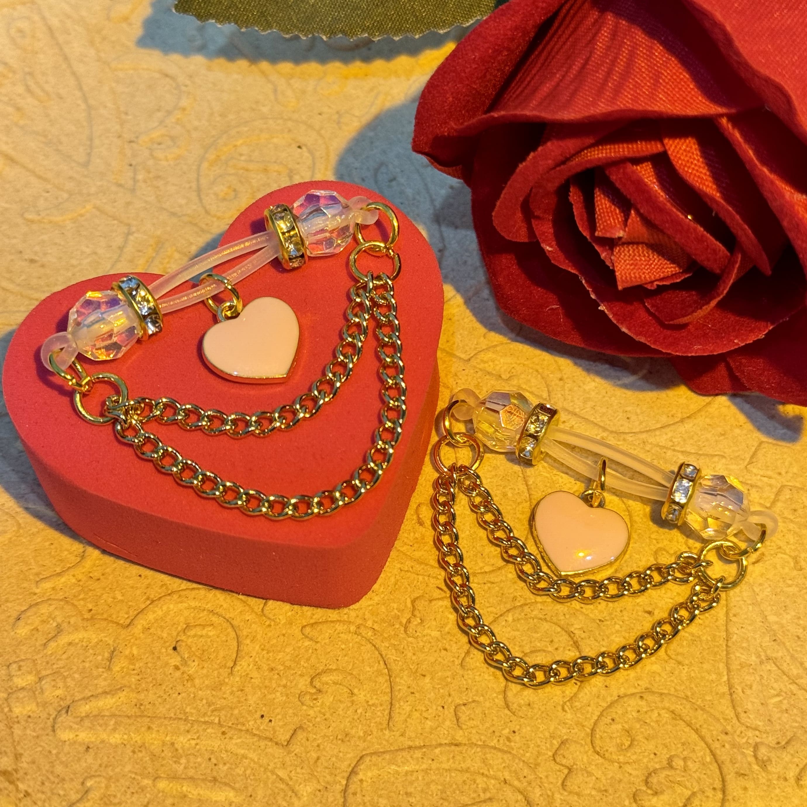 These elegant nipple clips feature a pink heart-shaped pendant and a gold chain. The adjustable tightness provides a gentle hold, ensuring comfortable wear and a stylish, sophisticated look, allowing you to wear them with confidence and comfort.