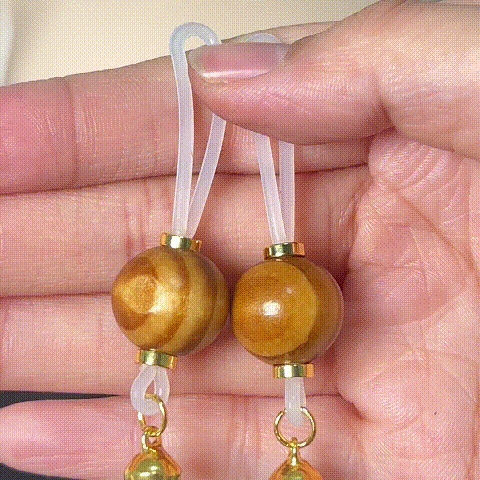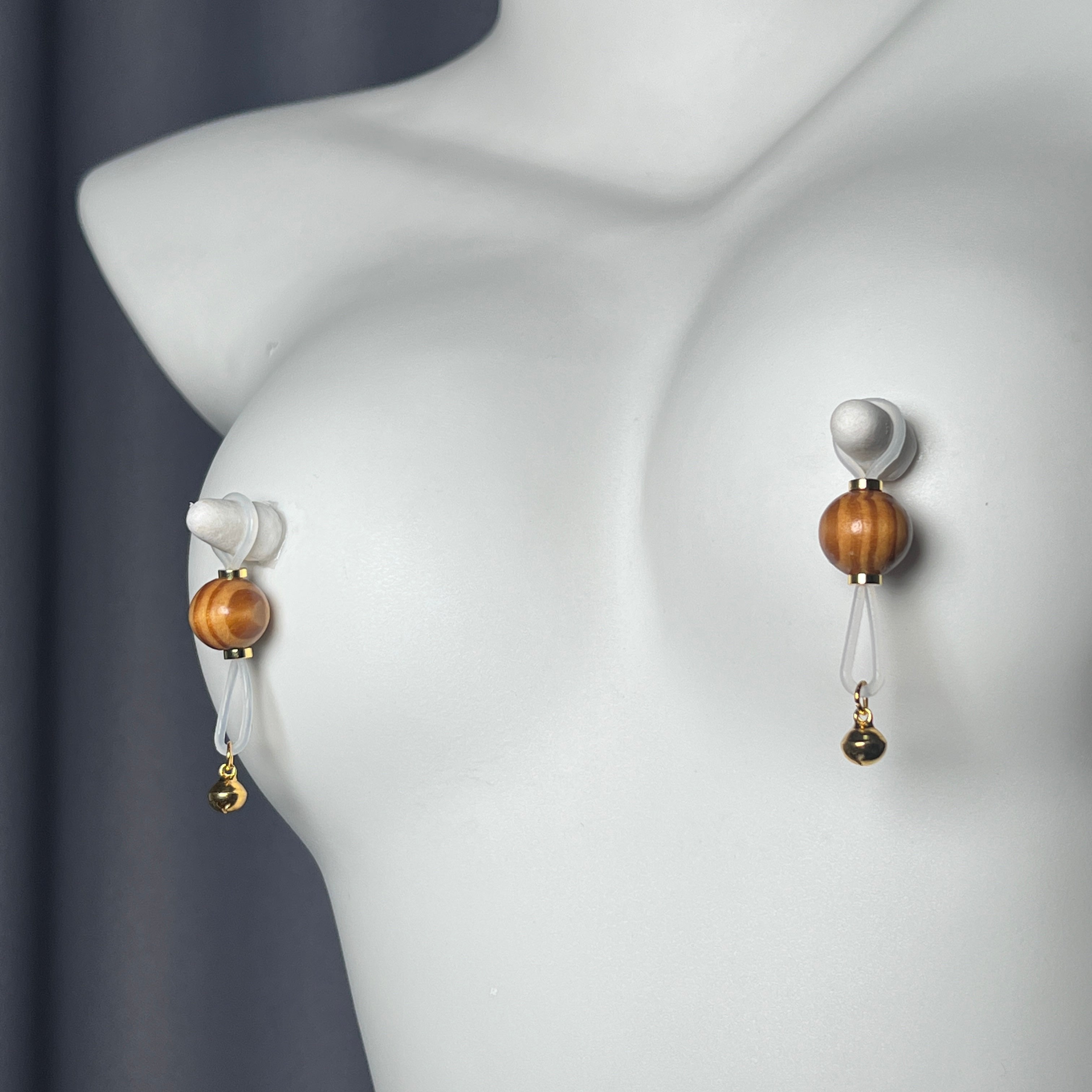 This adjustable nipple clip features a natural wooden bead paired with a gold-tone bell pendant, merging earthy charm with refined elegance. The smooth textures and warm metallic accents create a sophisticated yet playful accessory. Perfect for layering or standalone wear, the piece highlights subtle sensuality while maintaining modern, luxurious appeal. Its adjustable design ensures comfort and versatility, making it an exquisite addition to any curated collection of fine, artistic jewelry.