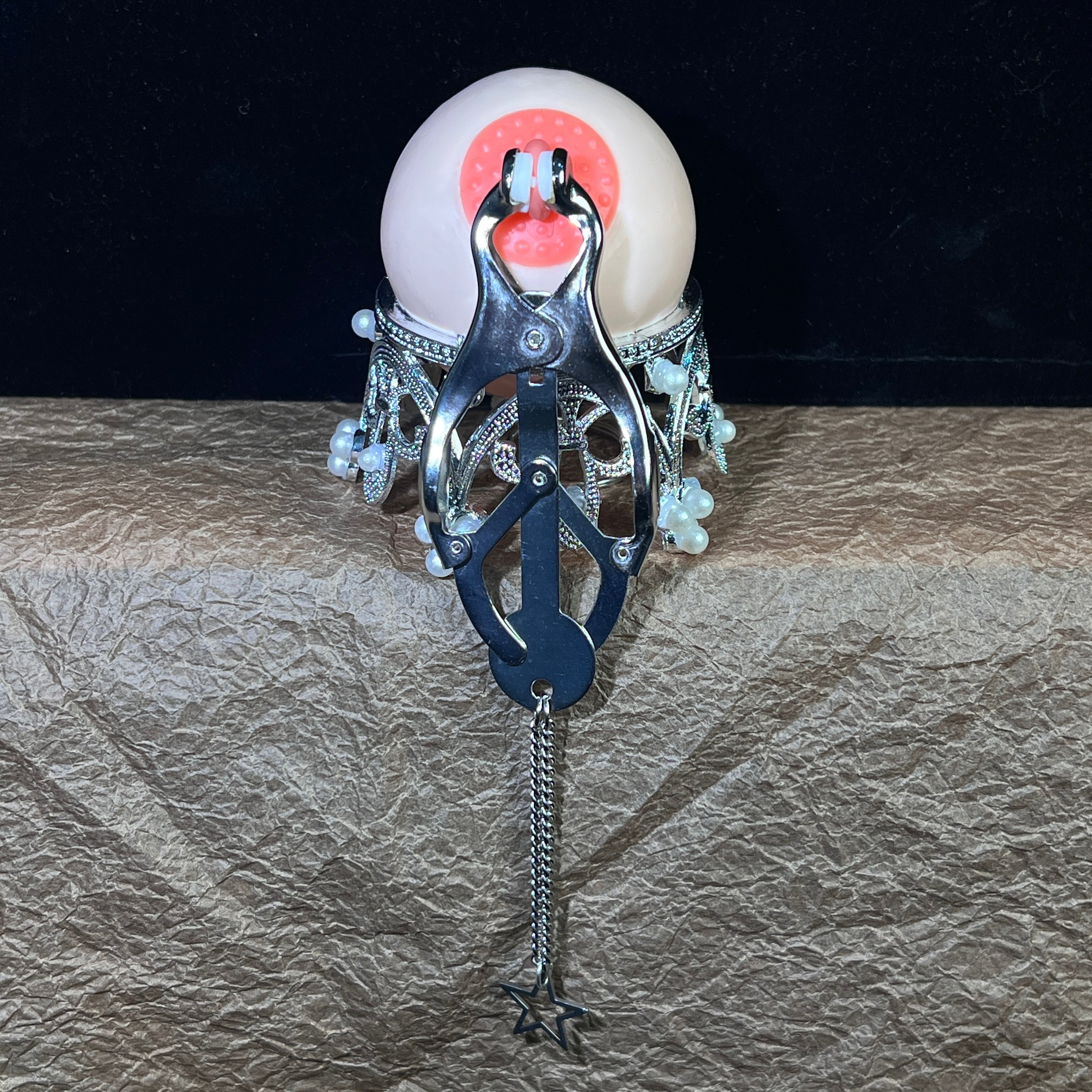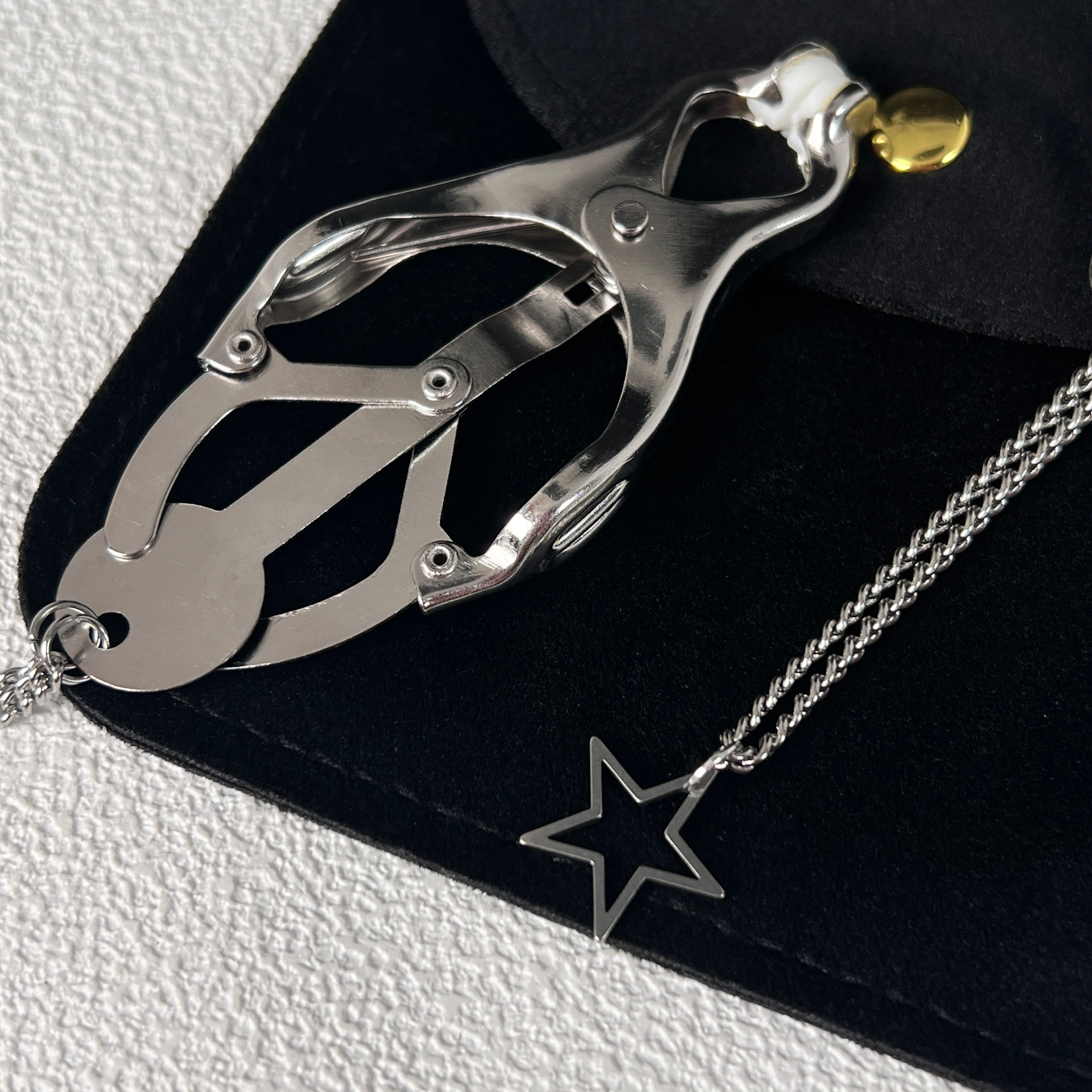 Featuring an irregular streamlined hollow frame paired with a chain-hung star pendant, this adjustable men’s nipple clamp showcases a sharp, elevated metal aesthetic. The pressure is fully customizable, with smooth, comfortable tips that balance pleasure and intensity. A refined accessory designed for personal expression and intimate sensory enhancement.