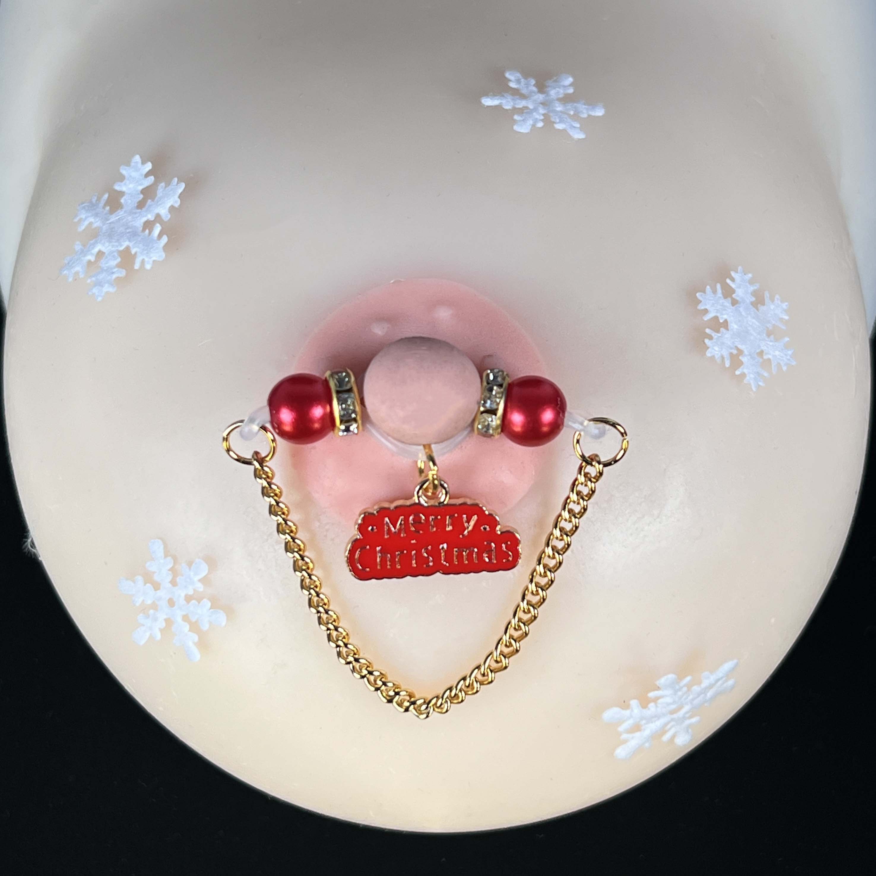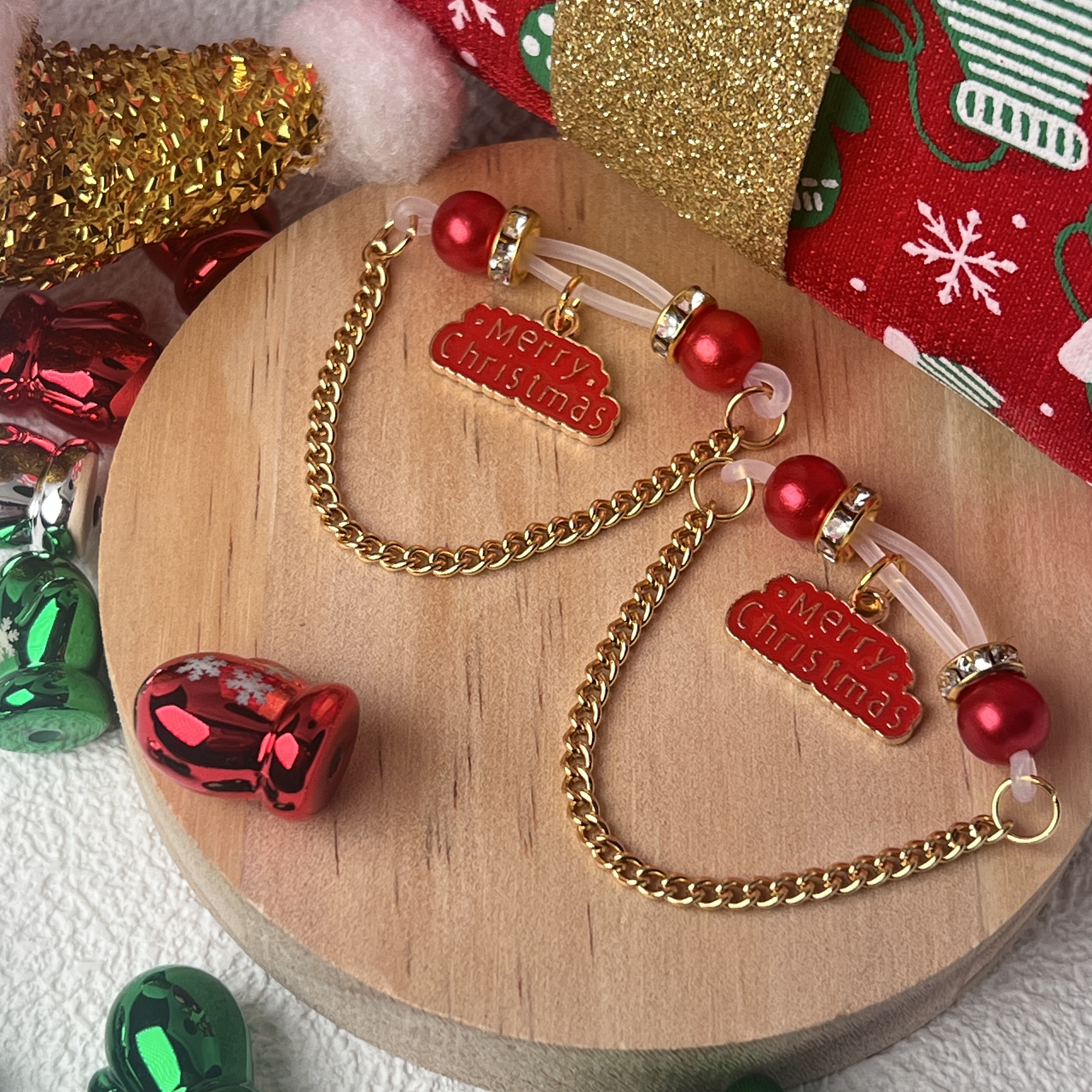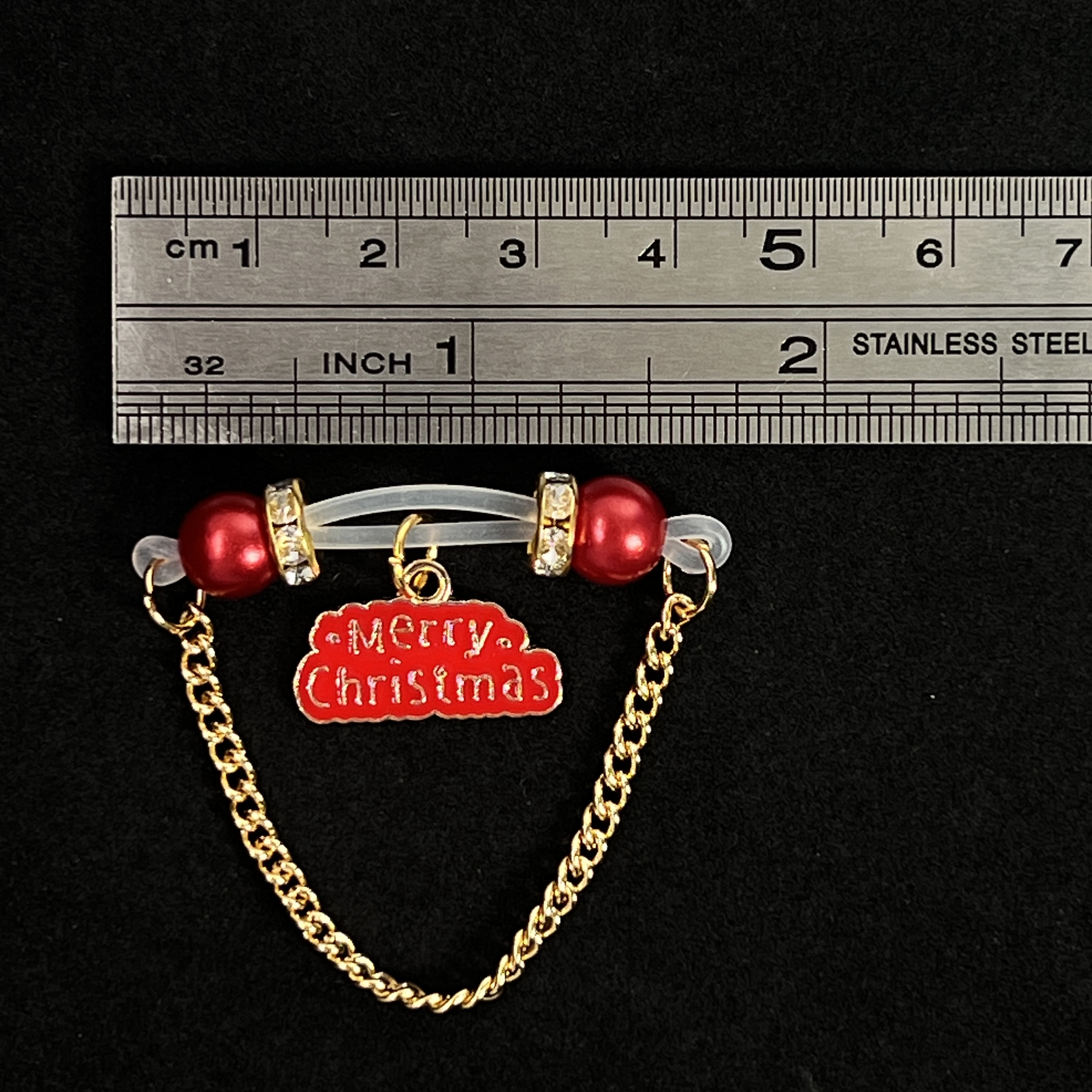 Featuring a red bead paired with a “Merry Christmas” charm and gold chain, this piece blends festive cheer with refined elegance. The adjustable nipple clamp ensures a comfortable fit, while sleek metallic lines and subtle shimmer convey understated luxury, highlighting sophisticated sensuality with seasonal charm.