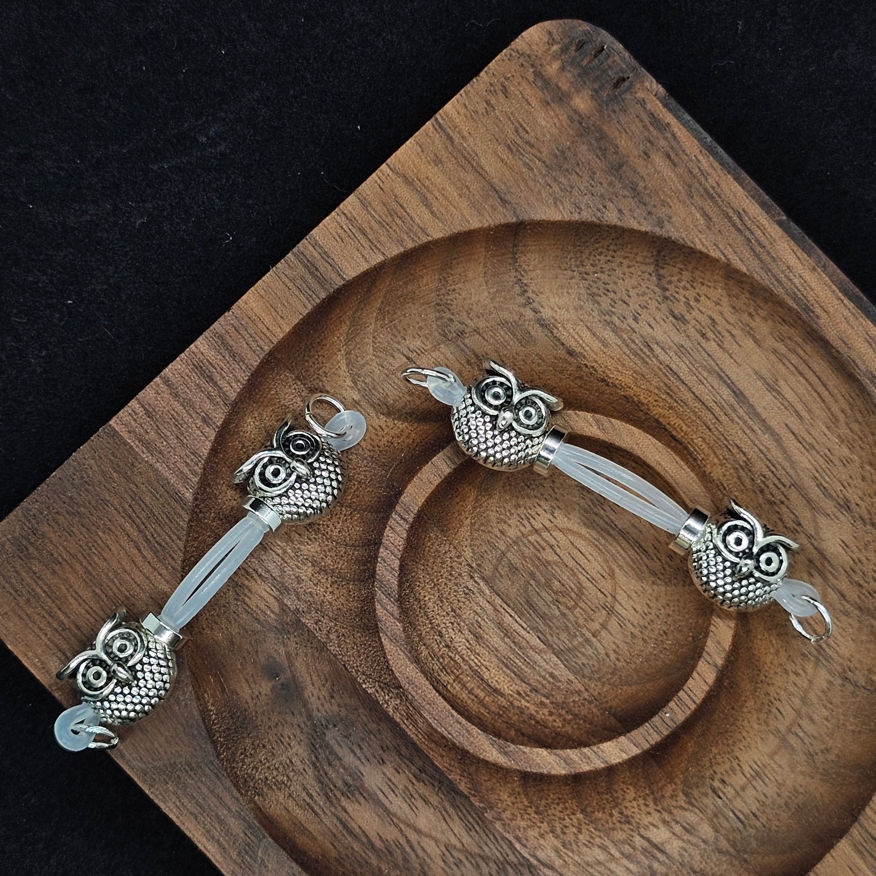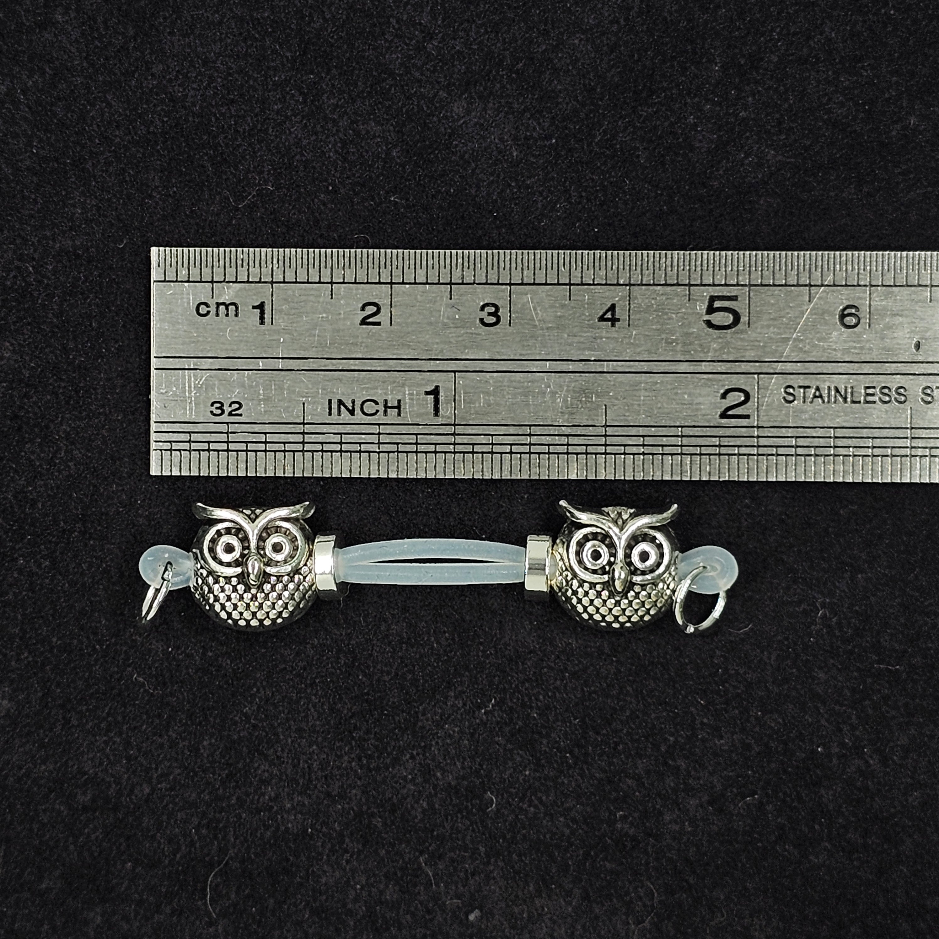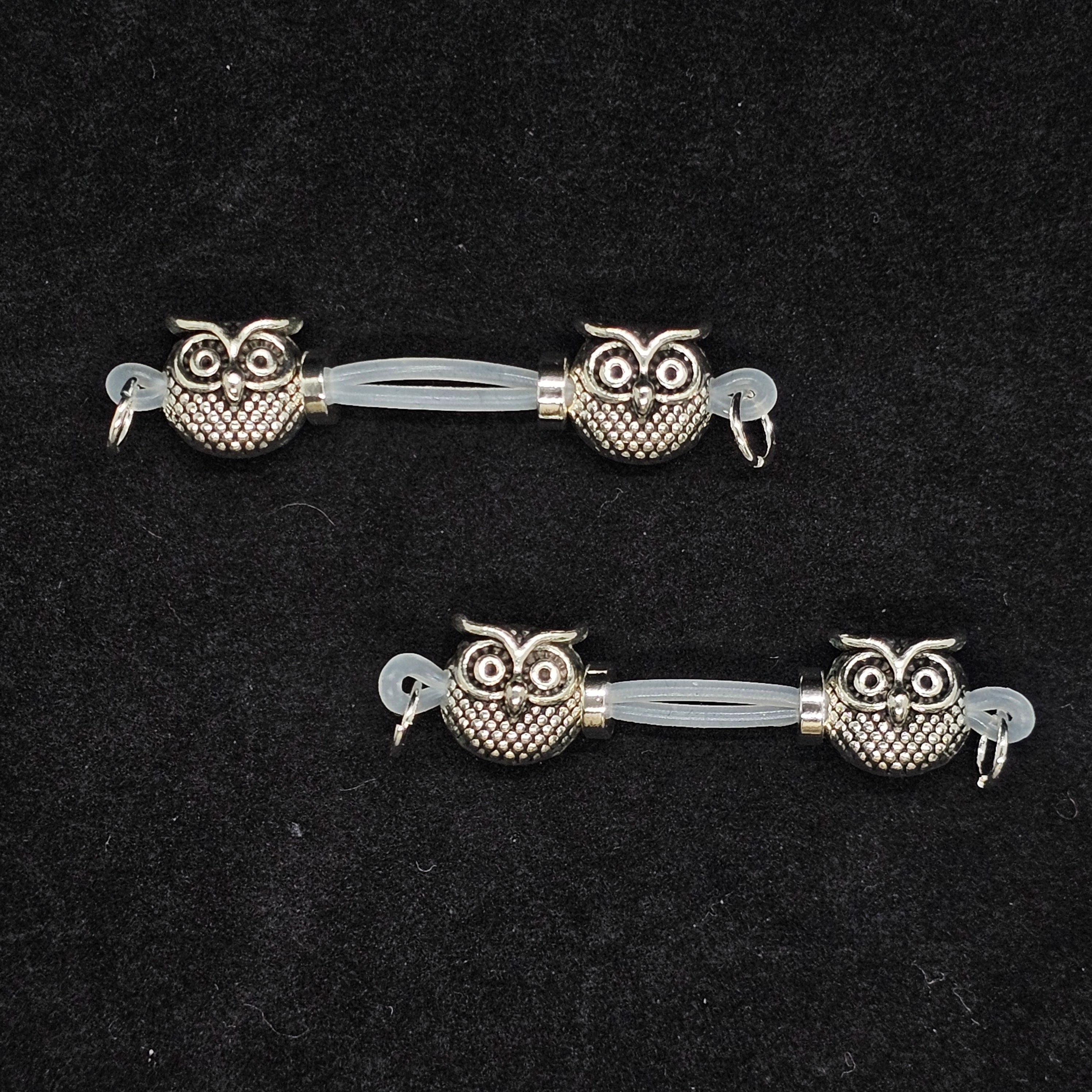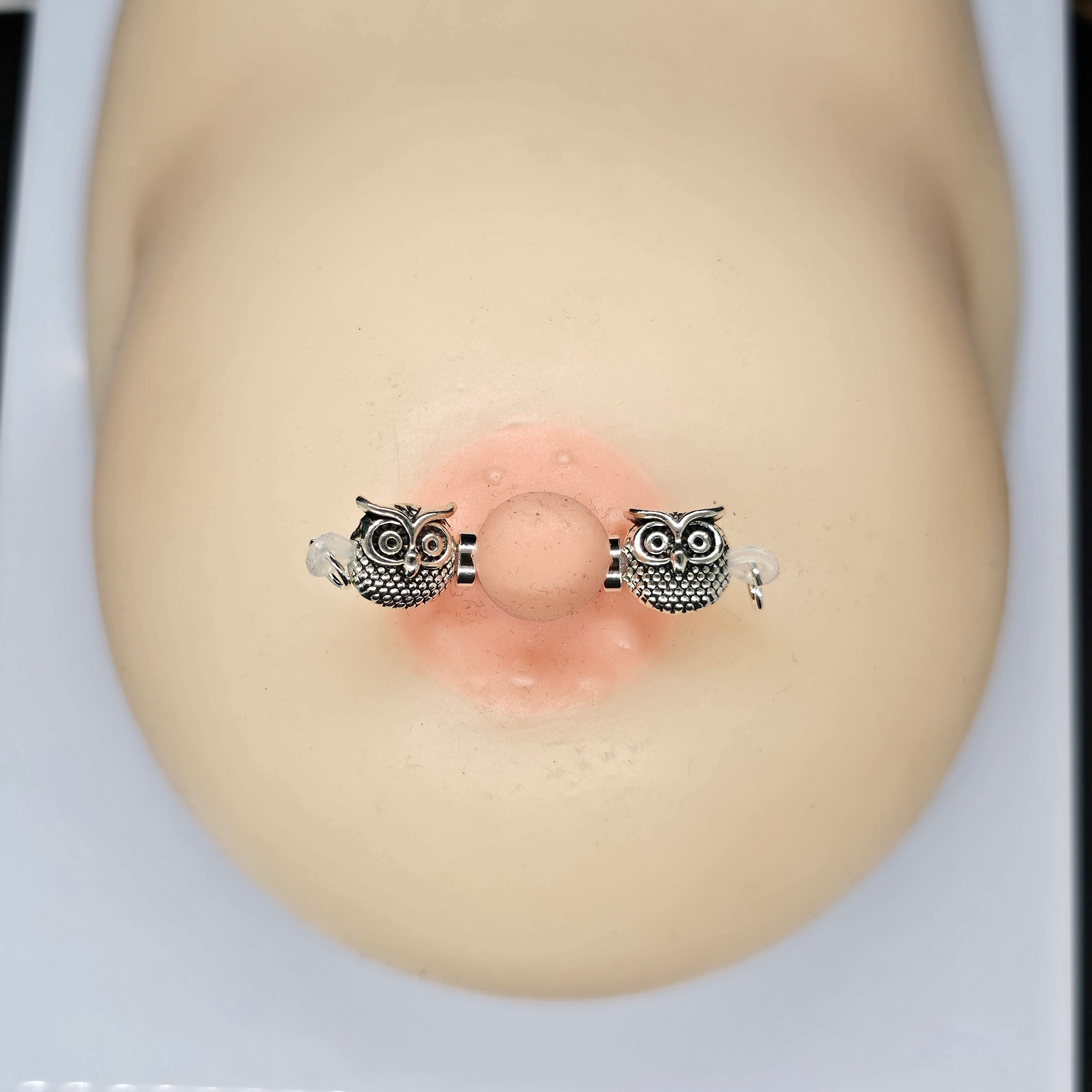 This barbell-style nipple clamp features silver owl-shaped beads, symbolizing wisdom and mystery. The intricate 3D carving highlights exquisite craftsmanship, while the adjustable design ensures comfort and a perfect fit. Whether for intimate wear or fashion styling, the owl bead exudes unique charm, combining elegance and individuality with understated luxury.
