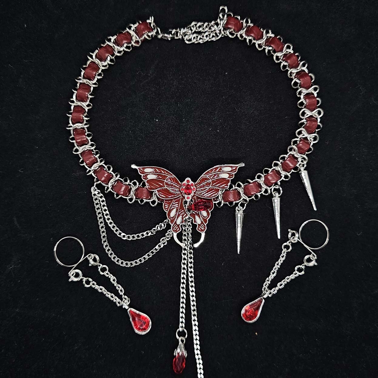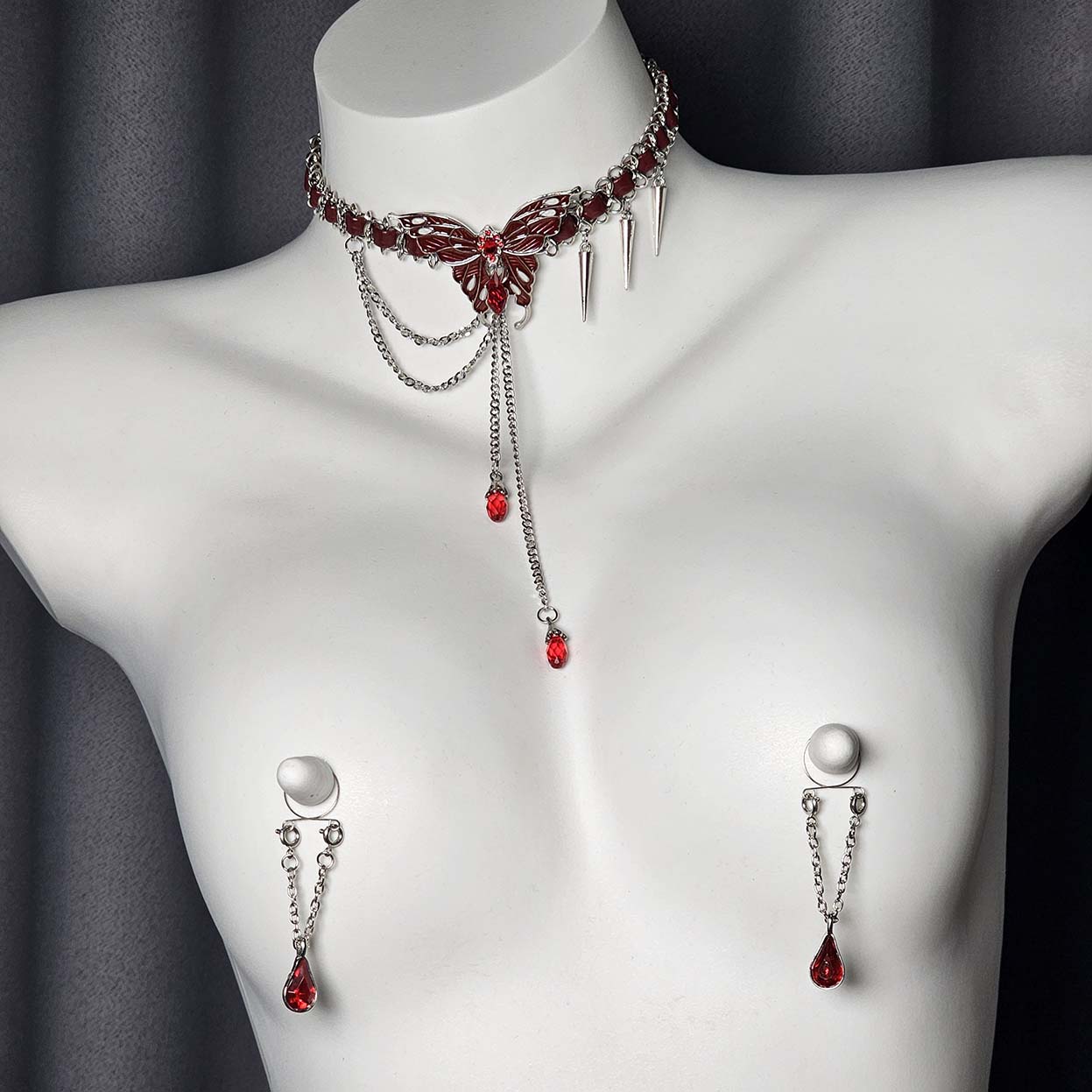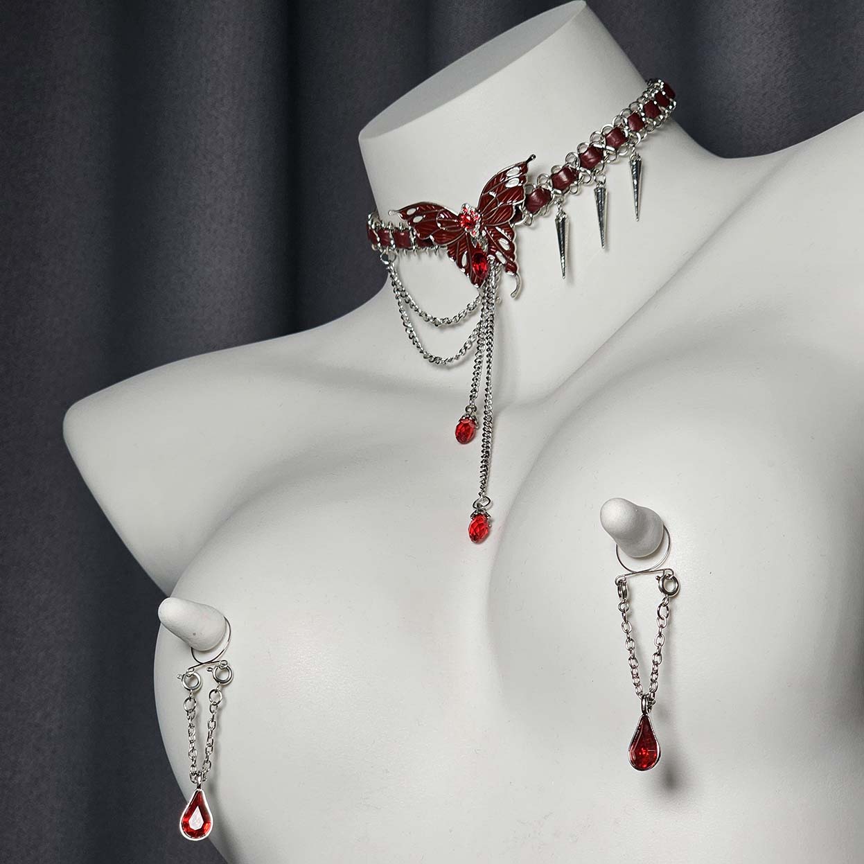 Each piece is handmade and made to order! A limited supply ensures uniqueness and rarity. With your purchase, you'll receive the latest necklace and nipple clamp set.An elegant pairing of adjustable nipple clips adorned with red teardrop gemstones and a silver chain necklace featuring a delicate red butterfly pendant. The fluid lines and vibrant hues merge sensuality with refined sophistication, creating a captivating and luxurious statement.