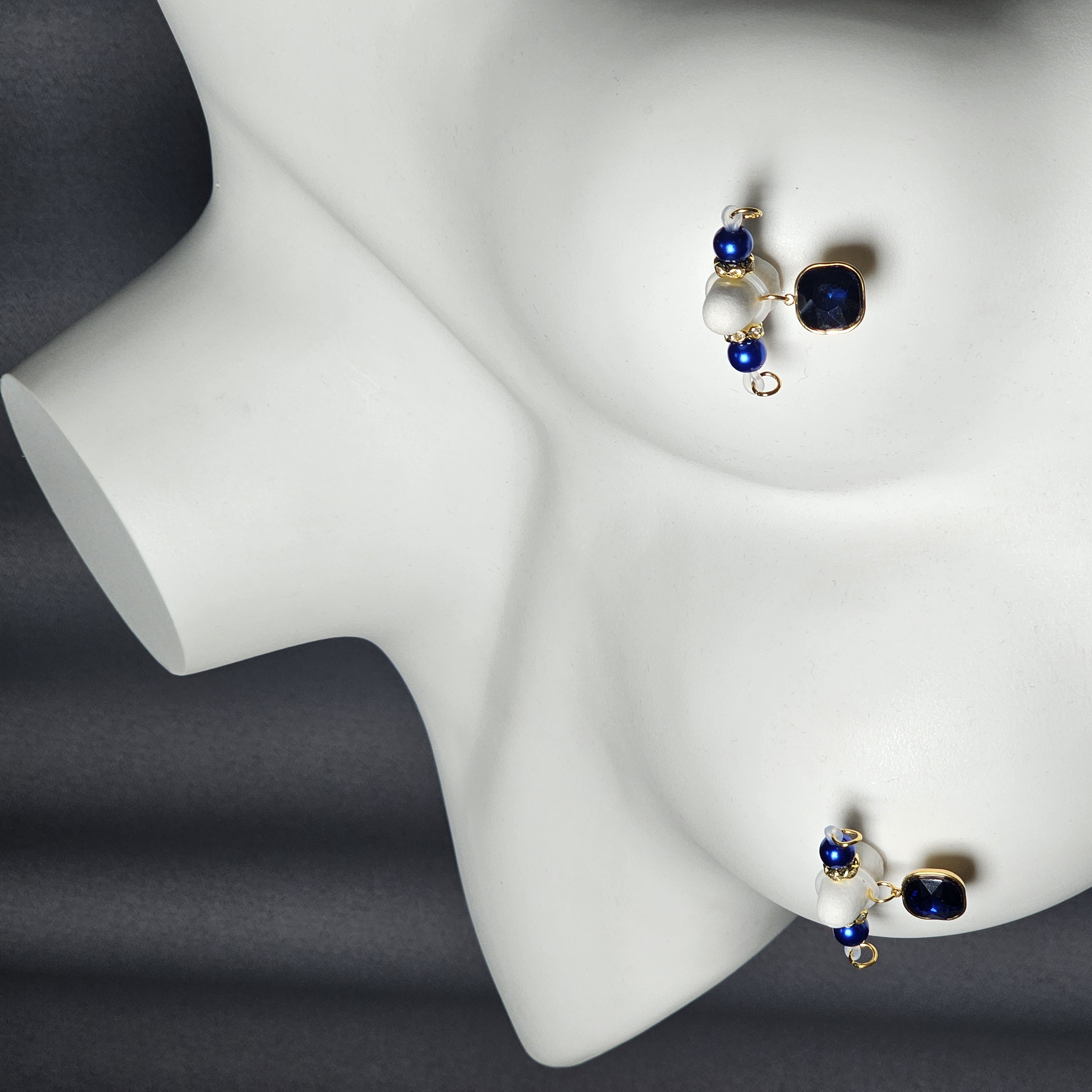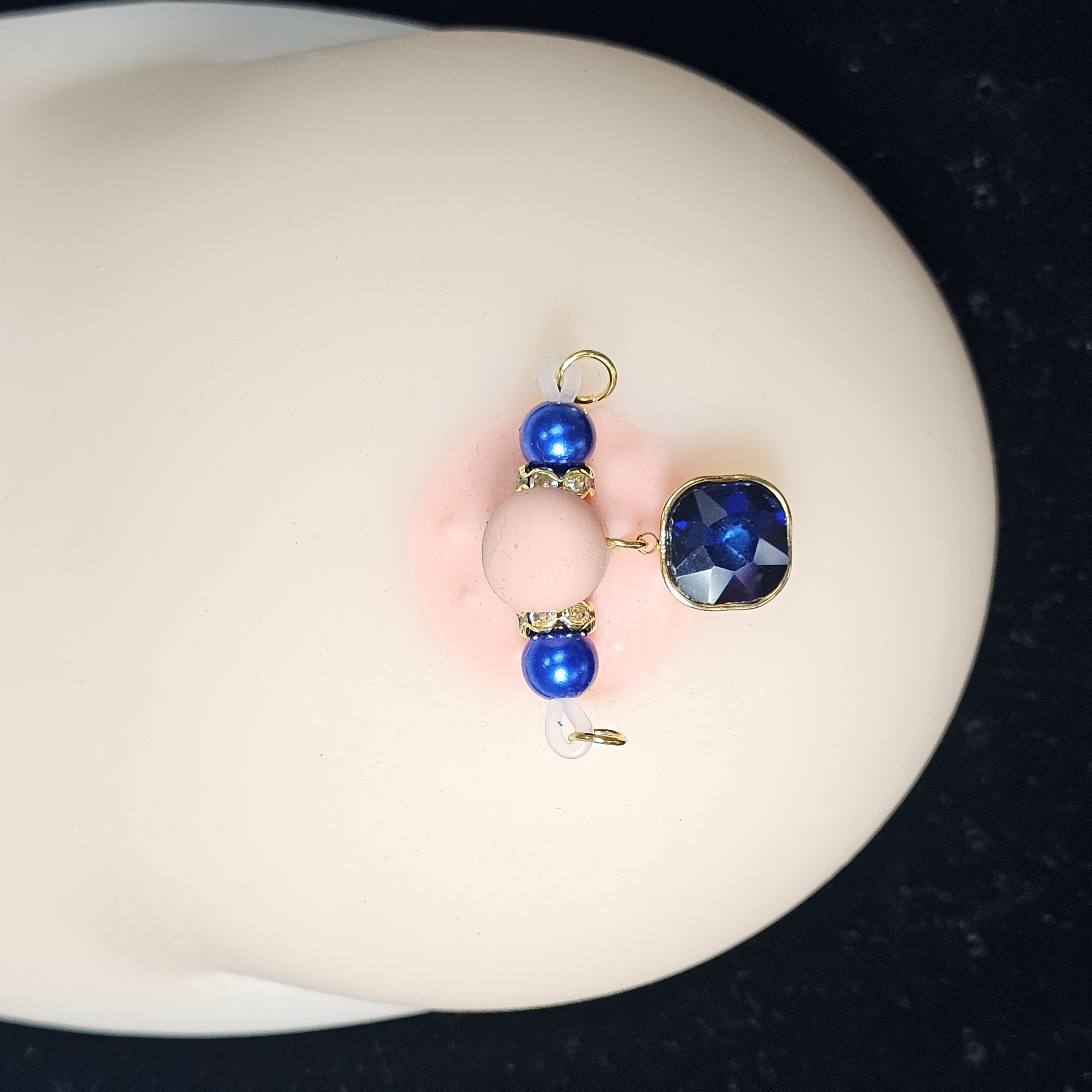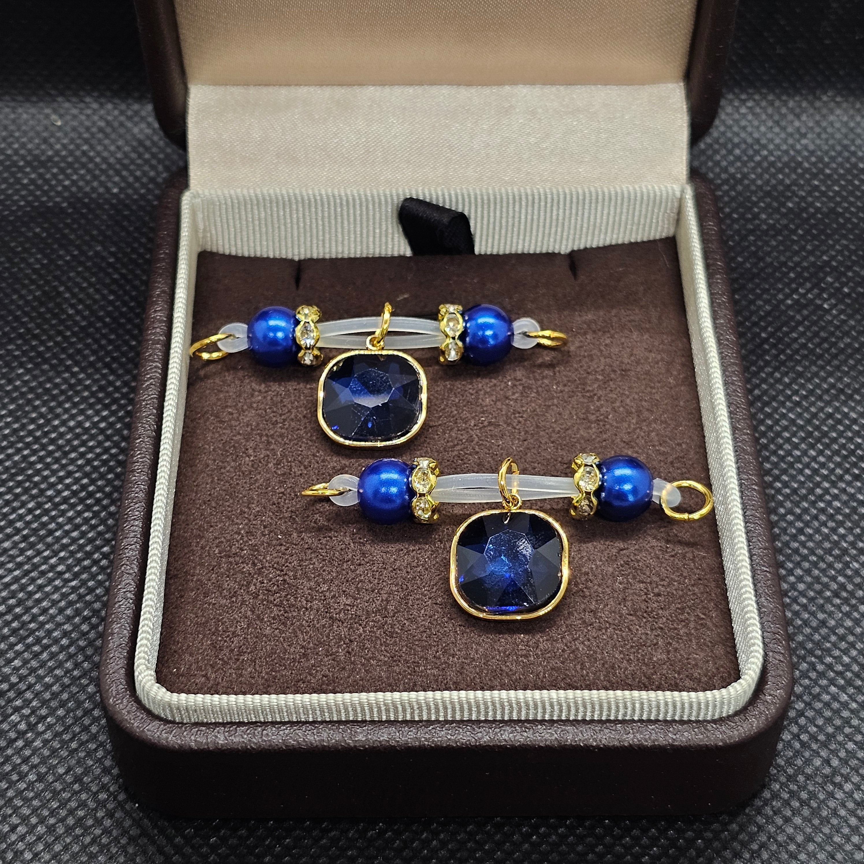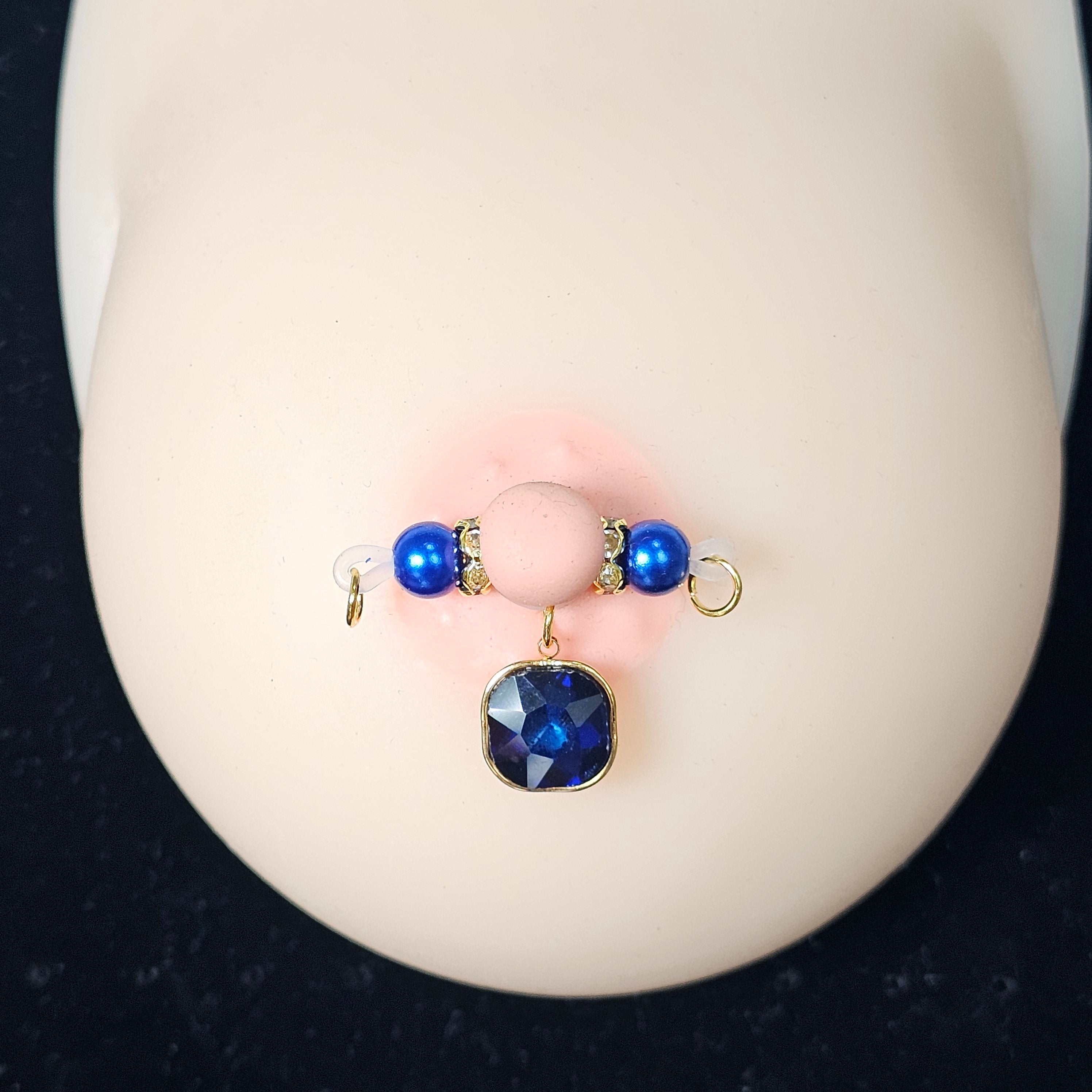 This adjustable barbell-style nipple clip features royal blue beads paired with a square multi-faceted gemstone pendant, exuding understated luxury. The gem’s deep brilliance mirrors the allure of a midnight sky. Crafted with precision for comfort and stability, it adapts seamlessly to any fit. The design is minimal yet elegant, capturing both strength and allure — a refined expression of sensual sophistication.