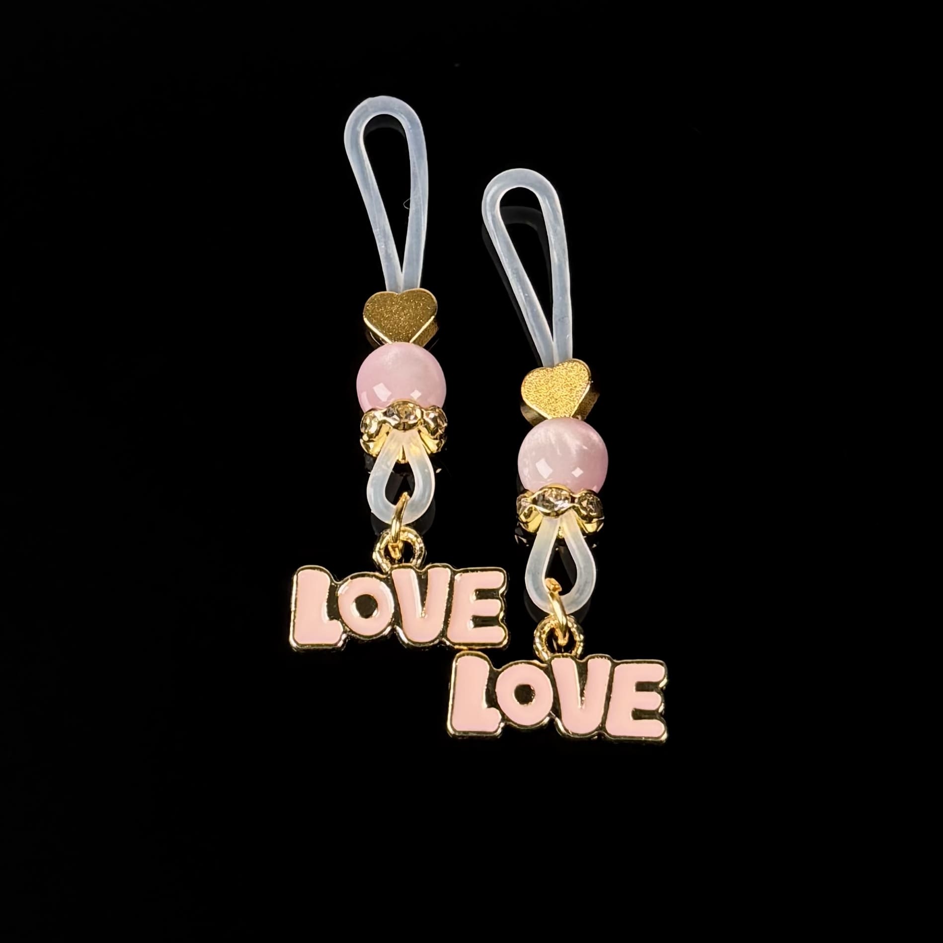 Elegant heart-accent nipple clamps with soft silicone loops, rose-toned beads, and lightweight charms. Adjustable tension ensures secure yet gentle wear, delivering balanced pressure and all-day comfort with a refined, playful finish.