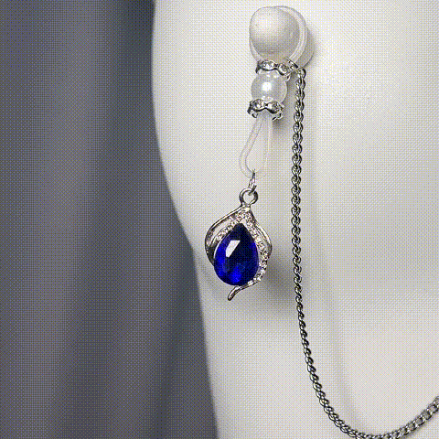 This sophisticated set features a multi-faceted blue pendant nipple clip paired with a pearl necklace and a silver chain adorned with a matching blue multi-faceted pendant. The design blends refined elegance with contemporary allure, balancing sparkling geometry and smooth textures. Ideal for layering or statement wear, the polished finish and harmonious color palette create a cohesive, luxurious look — perfect for expressing individuality with subtle sophistication and modern sensuality.
