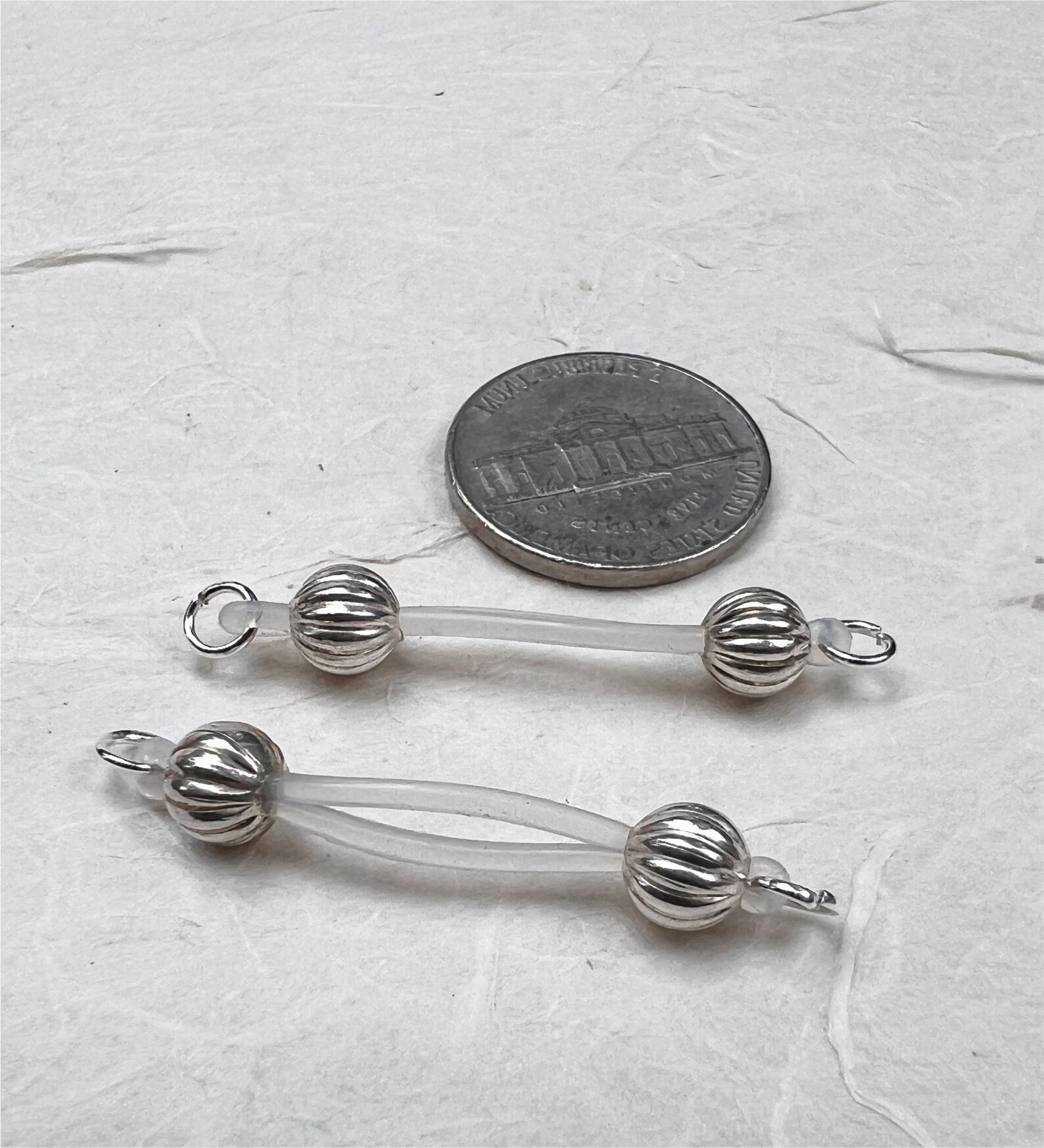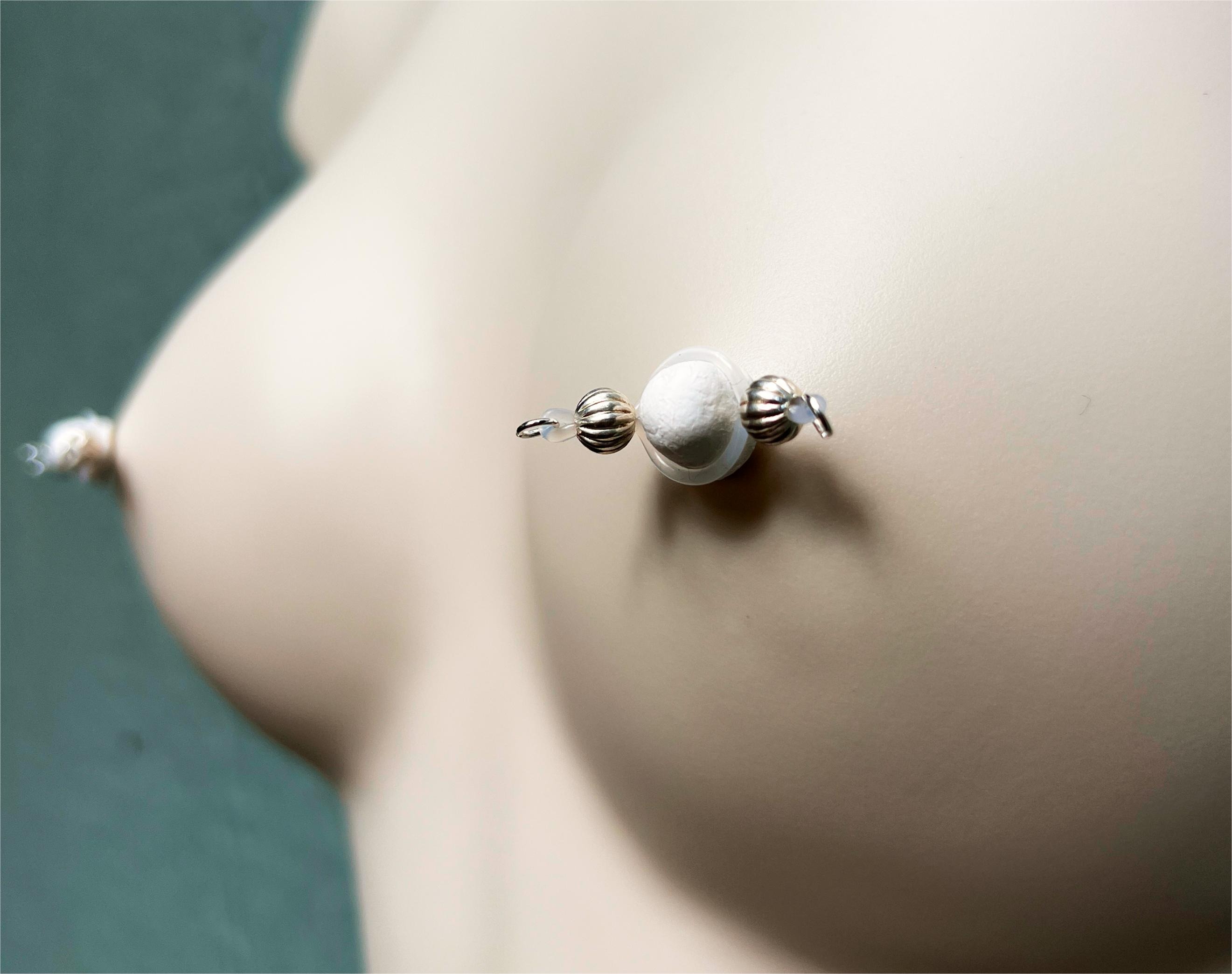 A pair of adjustable barbell style fake nipple piercers. Avoid pain and discomfort caused by piercing, safer and more hygienic. Made of food grade silicone band and sterling silver textured beads🩷