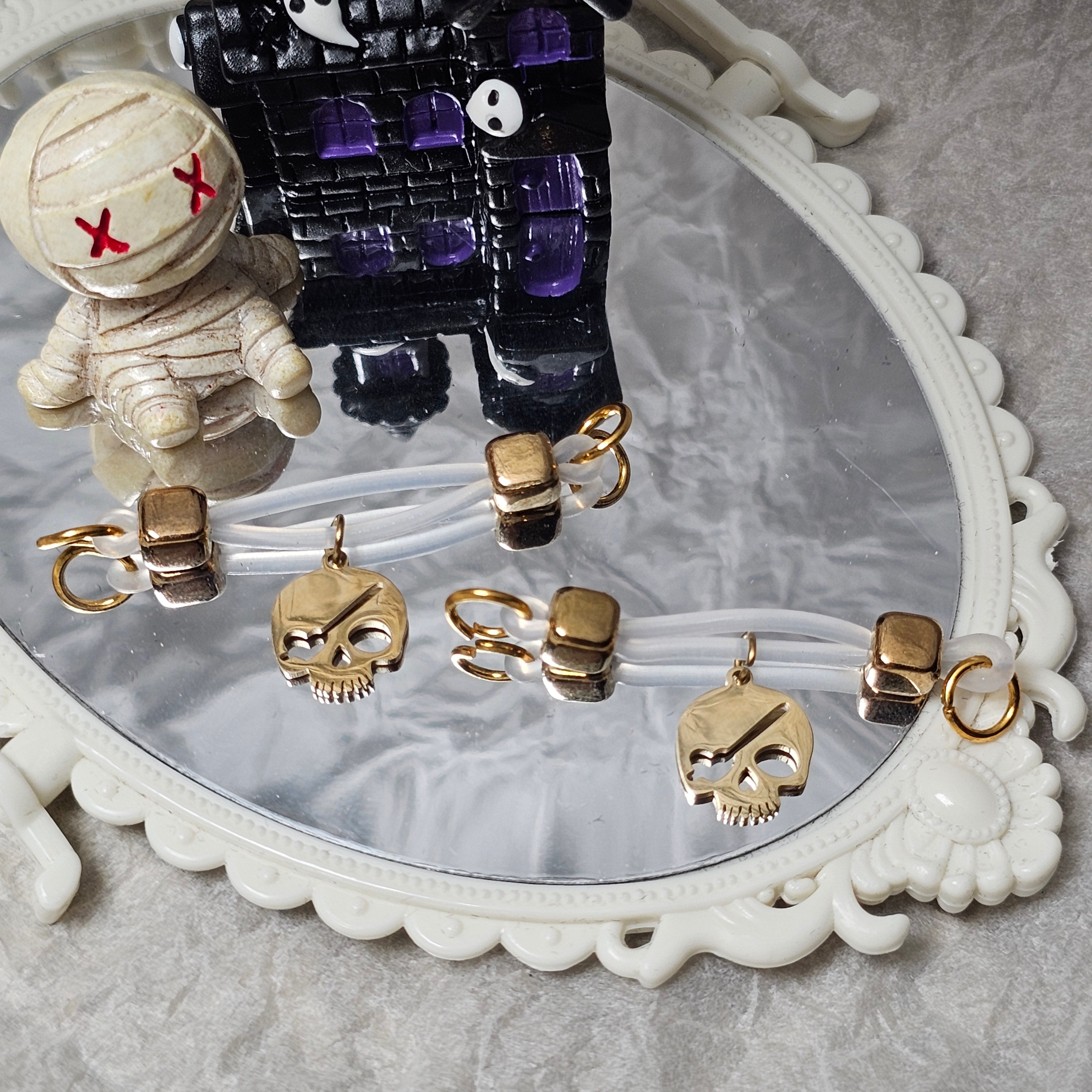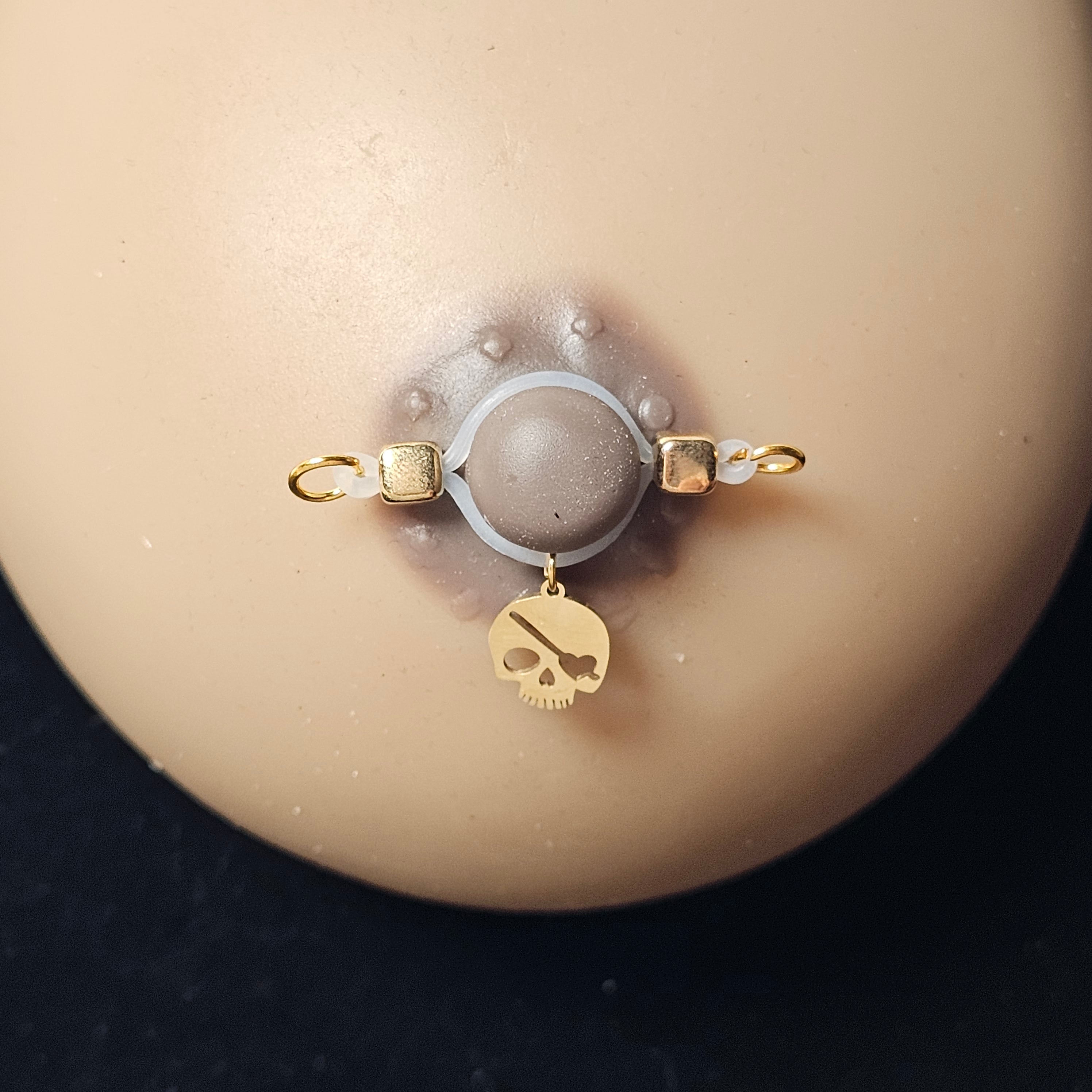 This nipple clamp perfectly blends rebellious and fashionable elements, showcasing individuality and unique charm. The pendant features an exquisite golden skull with intricate and striking details, creating a striking visual impact and imbued with the unique allure of rock and punk. The golden sheen exudes elegance and power, while also adding a touch of mystery. The adjustable design ensures a comfortable fit, adapting to different body shapes and ensuring long-term wear without discomfort. This nipple clamp is not only an expression of self-expression but also a bold embrace of fashion trends. Perfect for those who challenge convention and pursue a unique style, it will add a touch of elegance and charm to your overall look, whether for everyday wear or special occasions.