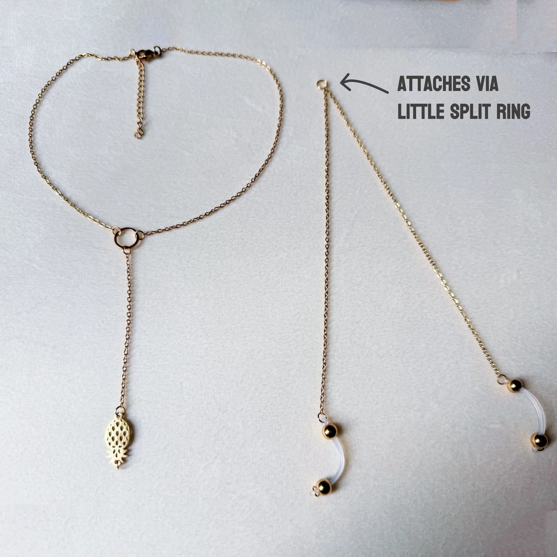 A dainty gold chain necklace (with a pineapple charm) that links to soft-silicone clips. Lightweight, gentle on skin—seamless dual-wear, adding luminous, playful glamour to any look.