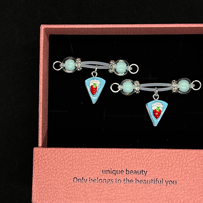 These barbell-style adjustable nipple clips, adorned with refreshing mint green beads and strawberry cake-shaped pendants🍰, perfectly blend sweet girlishness with a touch of edgy sexiness. They possess both the playful vibrancy of candy colors and the elegant details of delicate accessories, making them a bold yet adorable eye-catching accessory!