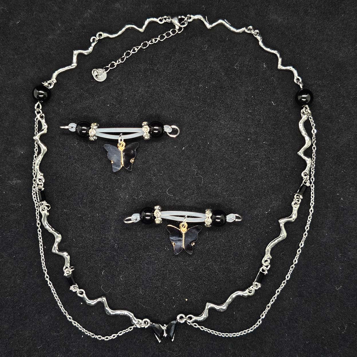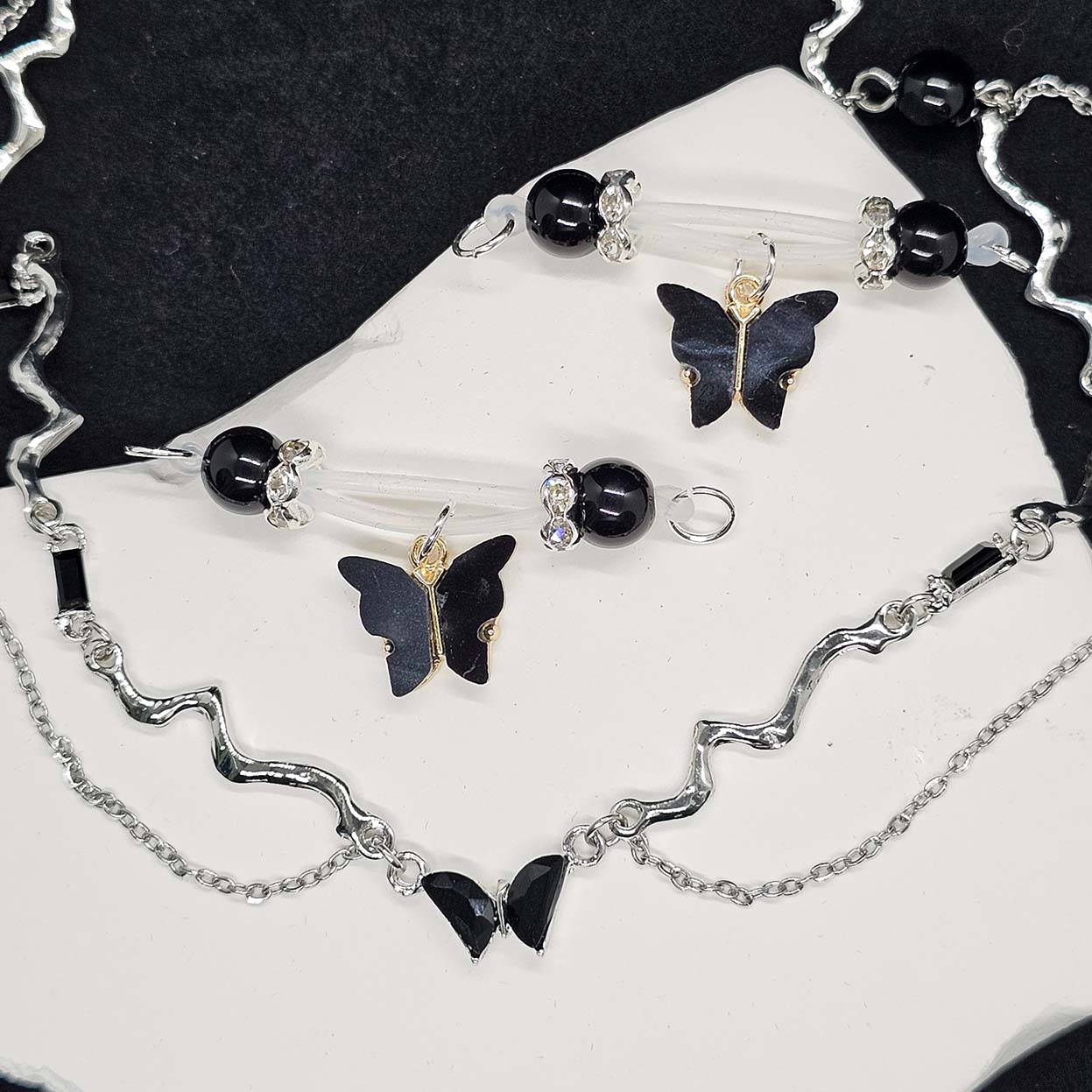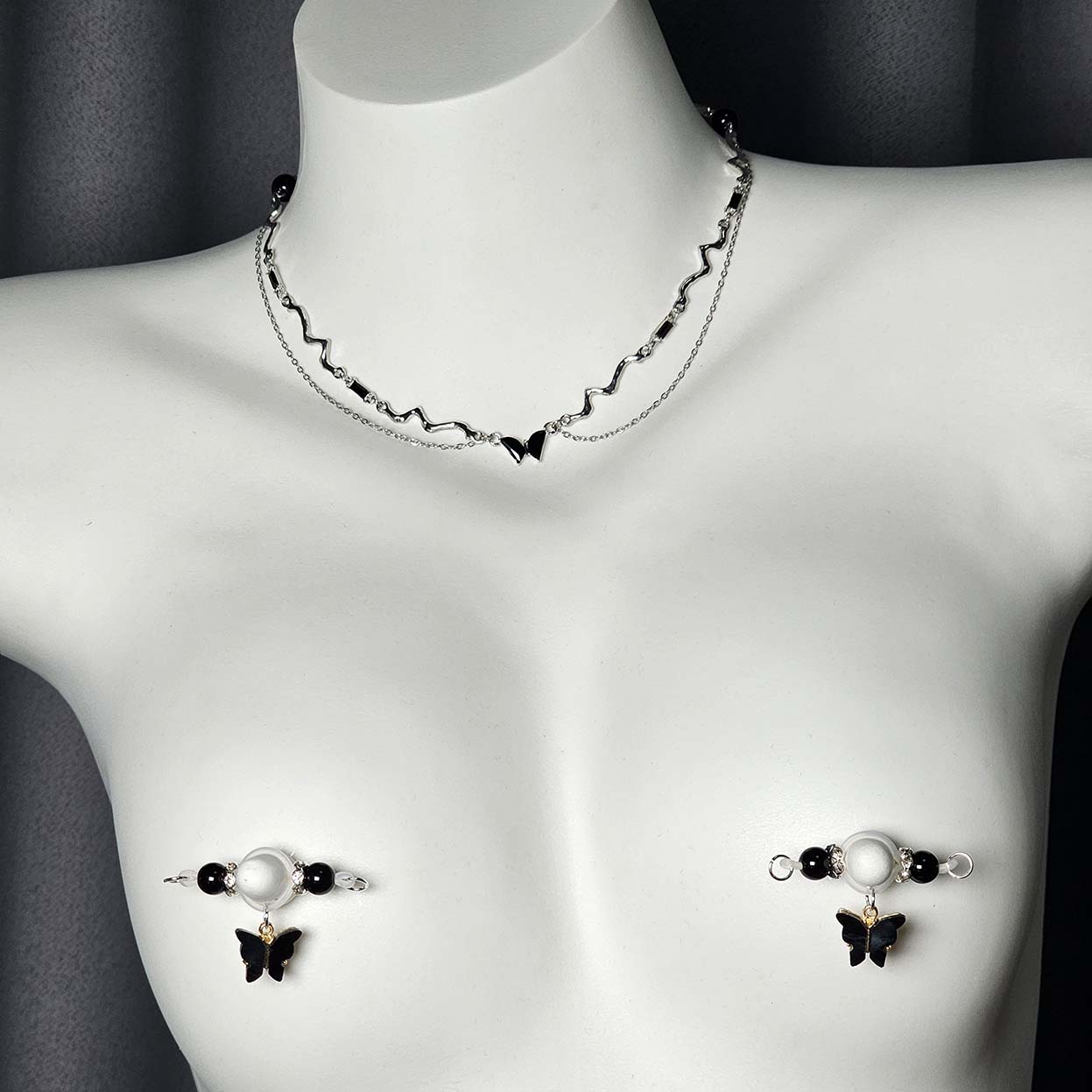 Each piece is handmade and made to order! A limited supply ensures uniqueness and rarity. With your purchase, you'll receive the latest necklace and nipple clamp set. A refined fusion of glossy black beads and a delicate butterfly pendant nipple clip, paired with a sleek silver chain adorned with irregular metallic accents. The bold contrast of dark and silver tones creates a sensual yet sophisticated statement, blending elegance with modern edge.